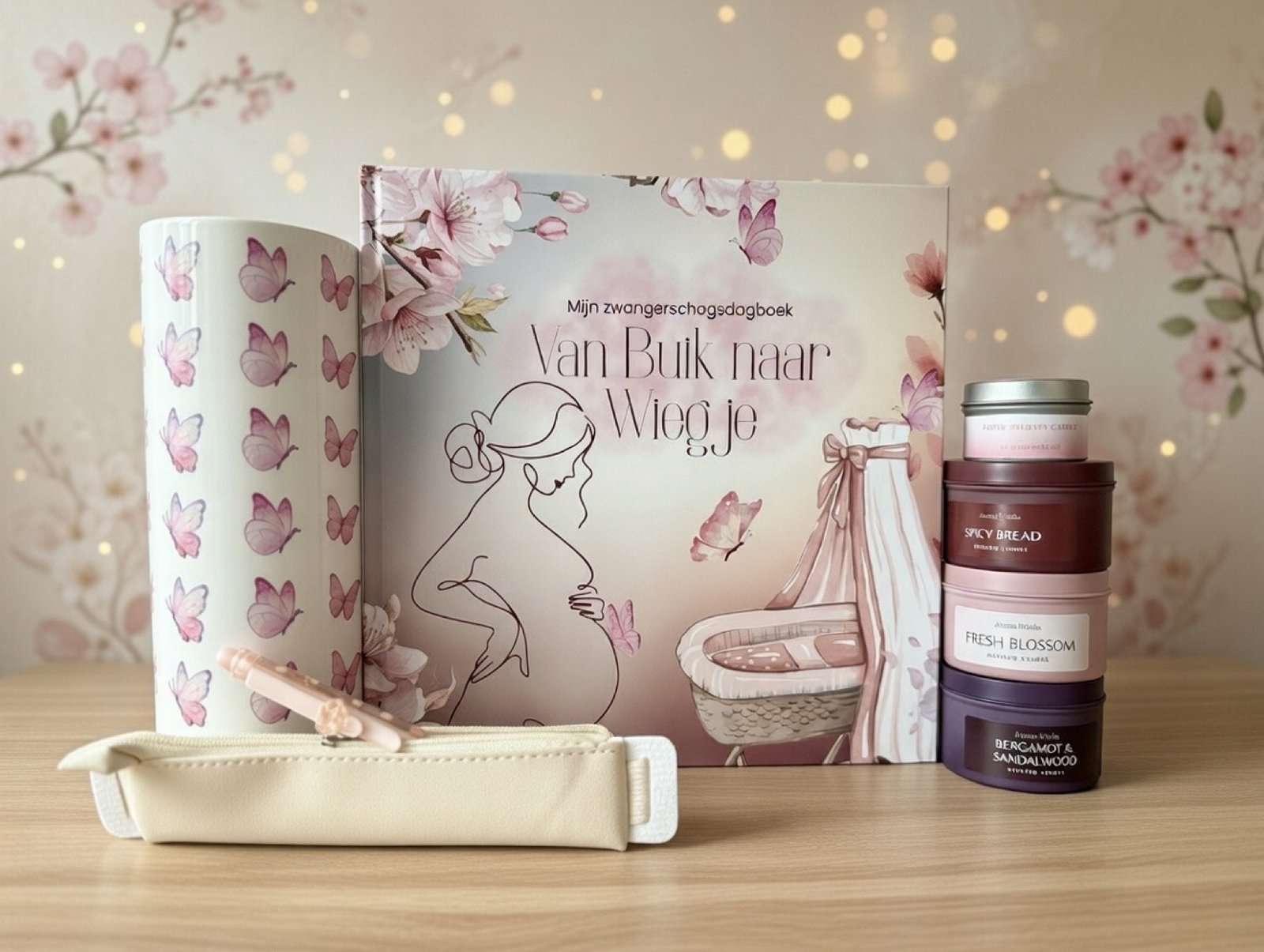 Een luxe Nederlandstalige zwangerschapsdagboek gift set met een dagboek, pen, kaars en stickers.